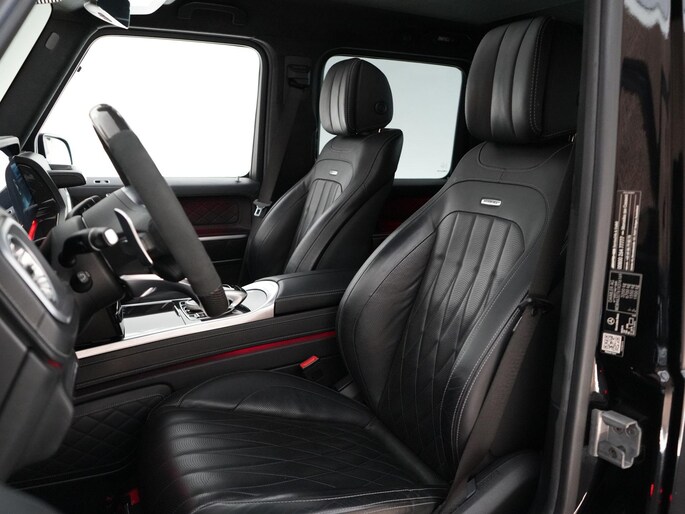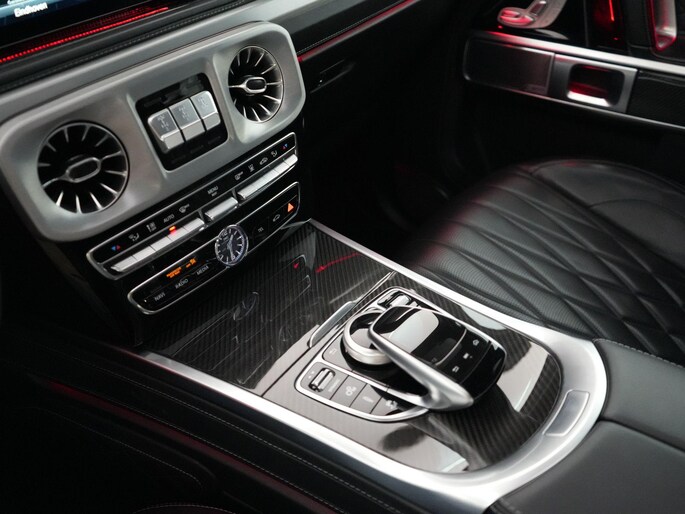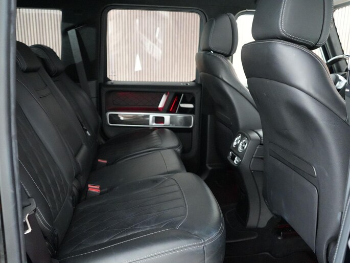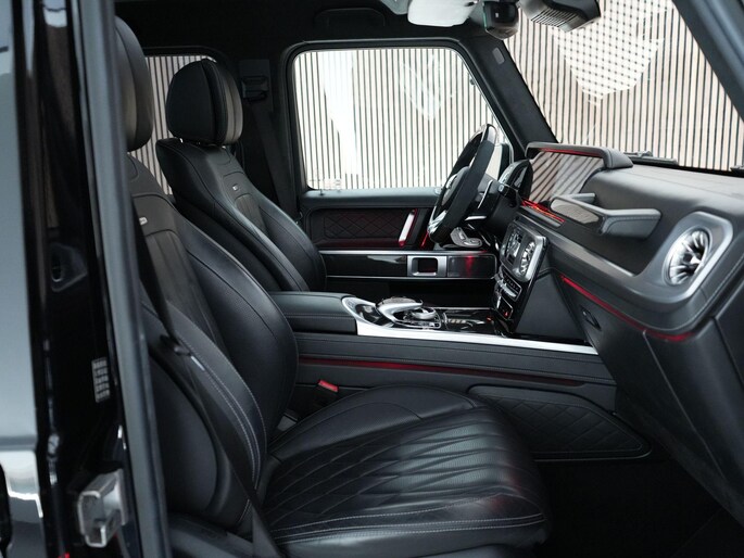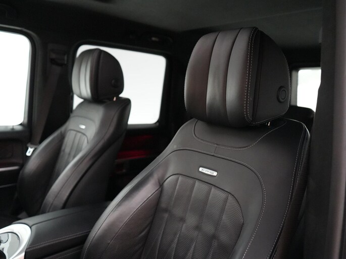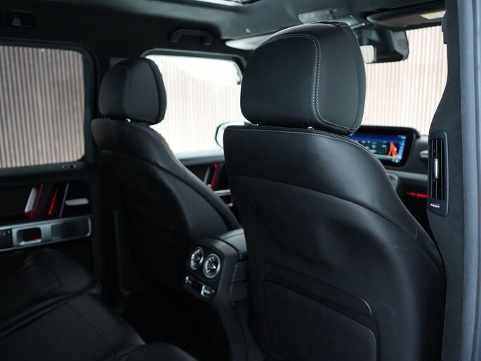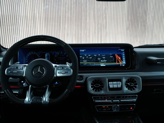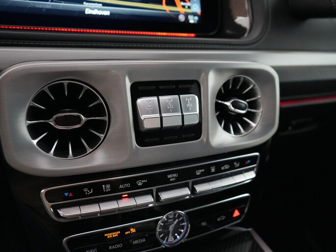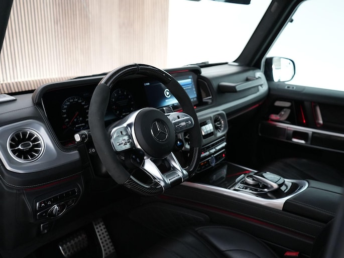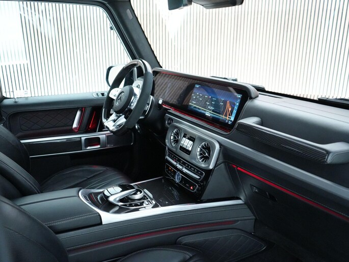 Deze G63 is ook gewoon goed uitgevoerd. Volledig nappaleder interieur, Burmester soundsysteem, panoramadak, ambient lighting en een digitaal display. Stoelcomfortpakket, verwarmd stuur, alles zit erop wat je dagelijks gebruikt.