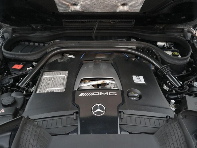 Dit is gewoon een G63 zoals je hem wilt zien. Zwart, Night pakket, 22 inch velgen en die brede wielkasten. Onder de kap ligt de bekende 4.0 V8 biturbo. Starten en je hoort direct wat het is. In combinatie met het schakelbare uitlaatsysteem klinkt hij precies goed: rustig als je wilt, maar met genoeg geluid zodra je gas geeft.