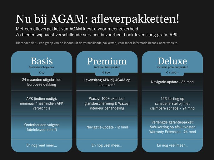 Profiteer tijdens de AGAM Paasactie van € 2.000,- extra inruilkorting én ontvang het Premium afleverpakket t.w.v. € 899,- geheel gratis! Tot en met vrijdag 10 april 2026 van deze tijdelijke AGAM Paasactie. Geldig op geselecteerde Certified voertuigen uit voorraad.