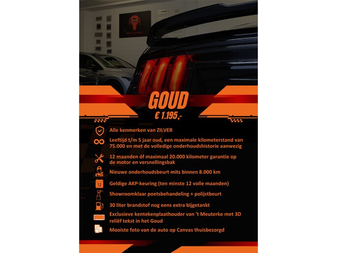 Dit afleverpakket bevat (in plaats van afleverpakket "Afleverpakket van 't Hoés - ''Gewoën good!''"): Geen nieuwe APK; 8 maanden óf maximaal 15.000 kilometer garantie op de motor en versnellingsbak (draaiende delen)., 20 liter brandstof nog eens extra bijgetankt., Exclusieve kentekenplaathouder van 't Meuterke met Chrome reliëf tekst in het Zilver., Geldige APK-keuring ten minste 9 volle maanden., Grote poetsbeurt interieur + exterieur., Met een overheerlijke Limburgse vlaai om mee naar huis te nemen!, Nieuwe onderhoudsbeurt door ons mits binnen 5000 kilometer aan de orde. - Afleverpakket GOUD (€ 1.195 meerprijs): De meest complete aflevering, alles tot in de puntjes verzorgd. Voor wie alleen genoegen neemt met het allerbeste! Voorwaarden auto: een leeftijd t/m 5 jaar oud, een maximale kilometerstand van 75.000 en met de volledige onderhoudshistorie aanwezig.