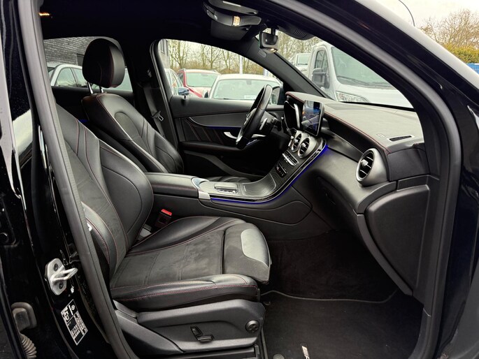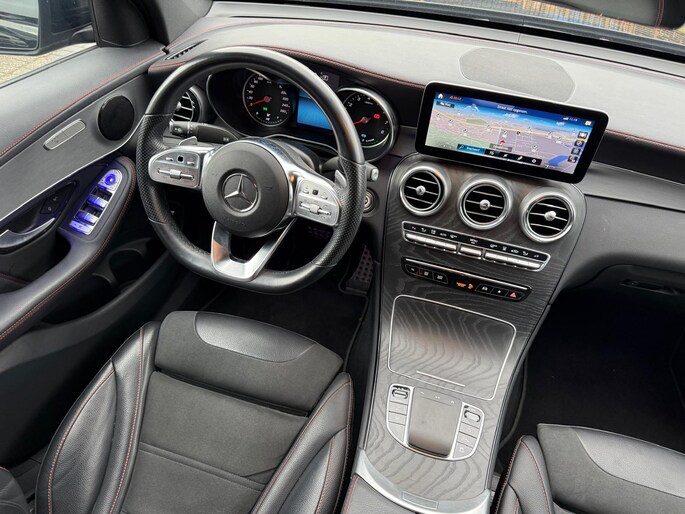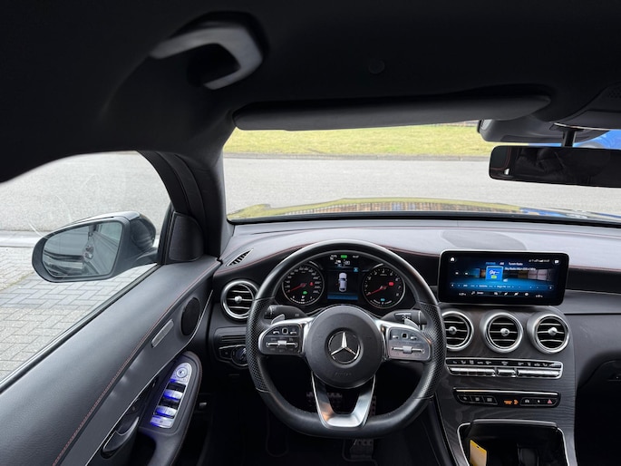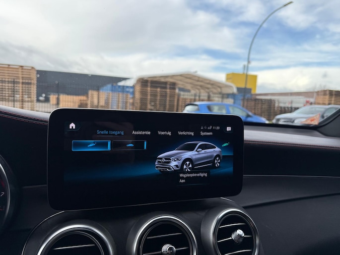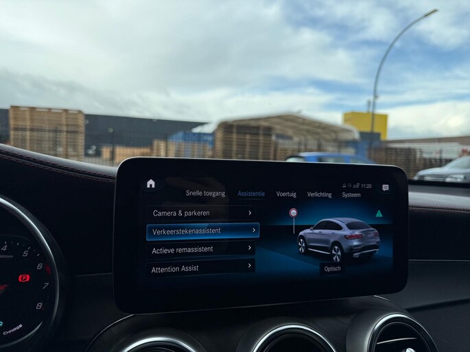 Rij- en route-info wordt perfect in beeld gebracht door het digitale dashboard. Zodra u naar de 'R' schakelt, gaat de achteruitrijcamera in werking en heeft u een perfect zicht op alles wat zich achter de auto afspeelt. Bij deze auto is uw smartphone een geavanceerde afstandsbediening. Remote services brengen u overal in contact met uw auto. U bedient het full map navigatiesysteem en het audio-installatiesysteem met DAB-radio via knoppen op het stuur, of zelfs met uw stem. Zo kunt u steeds uw aandacht gericht houden op de weg. Ook over uw schouder ziet u onderweg niet alles wat er aan de achterzijde gebeurt. Daarom heeft deze Mercedes-Benz GLC-klasse Coupé een achteropkomend verkeer waarschuwing. Ook WIFI-hotspot, automatische airconditioning, schakelpaddles aan het stuur, regensensor, cruise control en automatisch dimmende buitenspiegels horen tot de voorzieningen op deze auto.