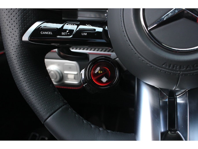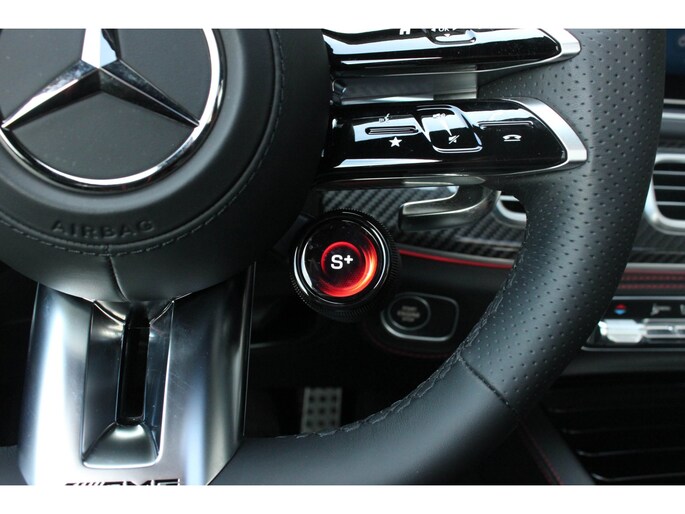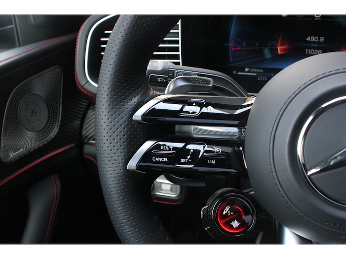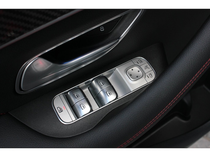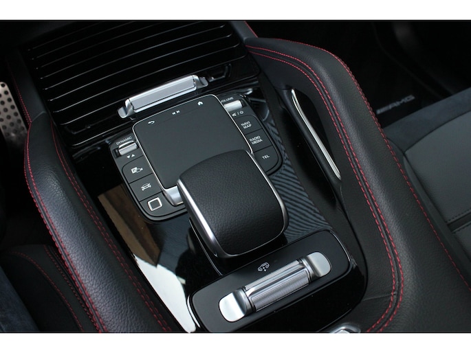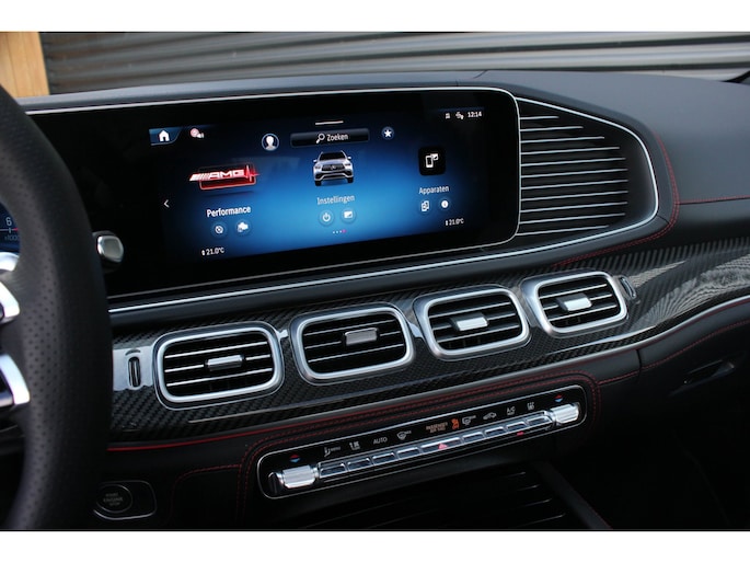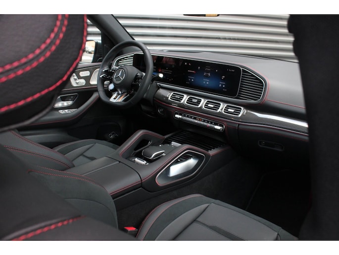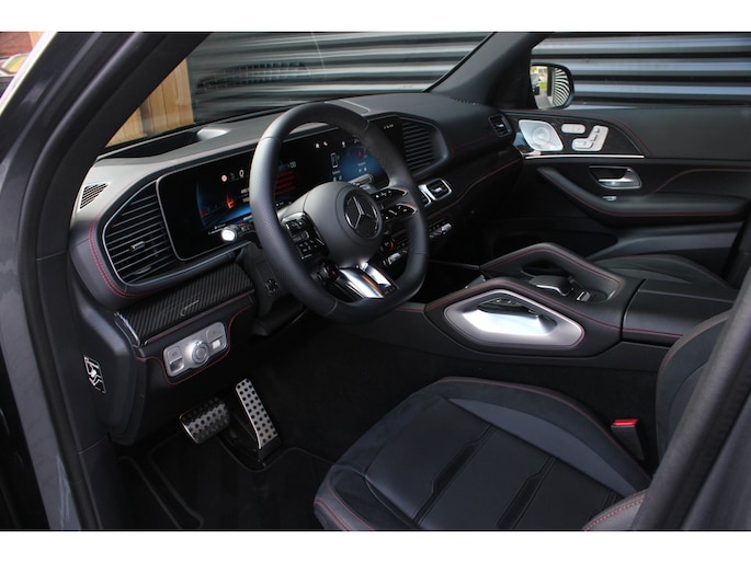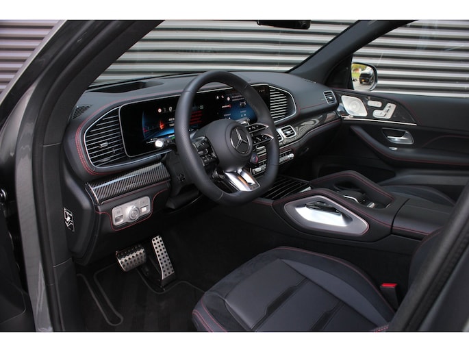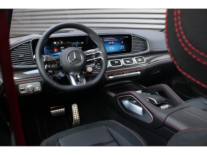 Binnenin wacht een oase van luxe en technologie. Zwart nappaleder met rode veiligheidsgordels, een verwarmd AMG-sportstuur en sfeerverlichting zorgen voor een elegante ambiance. De klimaatcomfortstoelen, zwarte hemelbekleding en Carbon sierdelen onderstrepen de hoogwaardige afwerking. Het Burmester Premium audiosysteem, het head-up display en het MBUX multimediasysteem met Augmented Reality maken elke rit tot een beleving op zich.