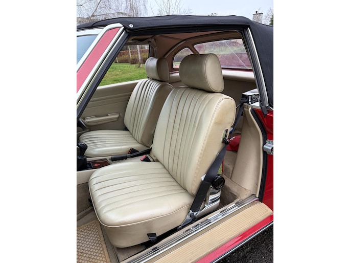 De buitenzijde is helemaal origineel en uiteraard roestvrij. De kleur heet “signalrot 568” en de lak heeft een mooie diepe glans. De auto is recent gepolijst, dus de body is kneiterglad. De originele kap lijkt wel als nieuw en je ziet aan alles dat de auto altijd binnen heeft geslapen. Er is ook een hardtop aanwezig, deze is nauwelijks gebruikt en dus ook in nieuwstaat. En de deuren sluiten nog steeds als een kluis zoals dat toen hoorde bij een Mercedes-Benz. Absolute topkwaliteit, zo worden ze niet meer gemaakt..