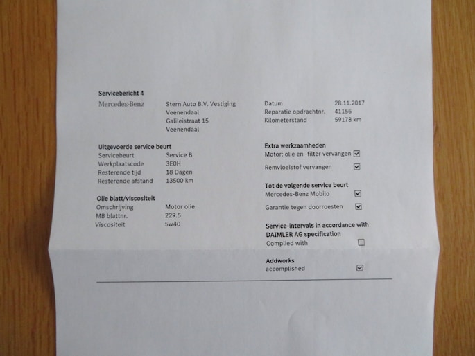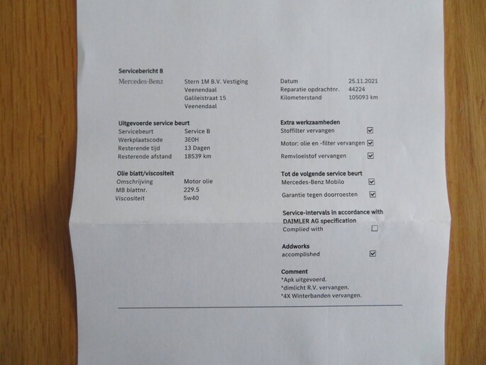 -ONDERHOUD: Deze auto is volledig door de Mercedes-Benz dealer onderhouden en heeft elk jaar netjes een onderhoudsbeurt gehad, de laaste 2 beurten zijn door een universeel autobedrijf gedaan. Complete Mercedes-Benz onderhoudshistorie (zie foto's op ozne website voor de complete historie van de 12 servicebeurten). De auto heeft bij 152.359 km km nog een onderhoudsbeurt gehad. Ook is de auto voorzien van 4 zeer goede Kleber All Season banden. De auto is geheel gepoetst aan de binnen en buitenzijde.