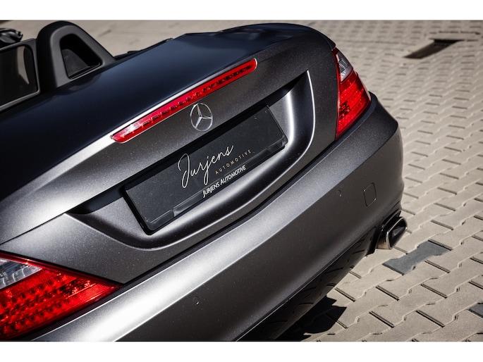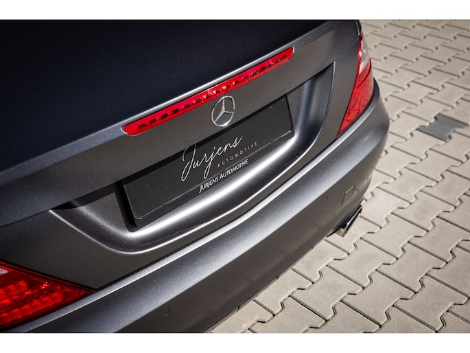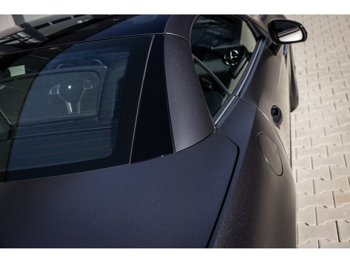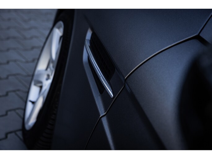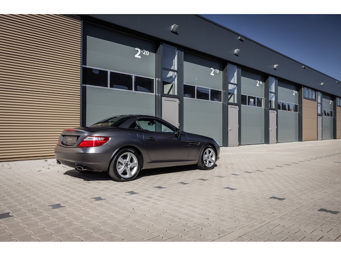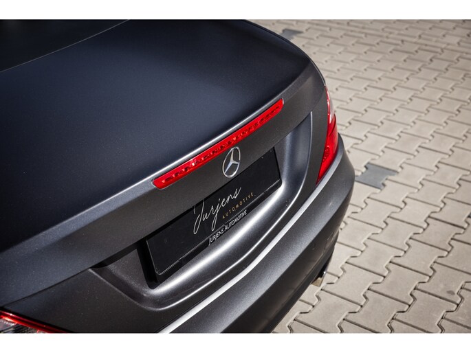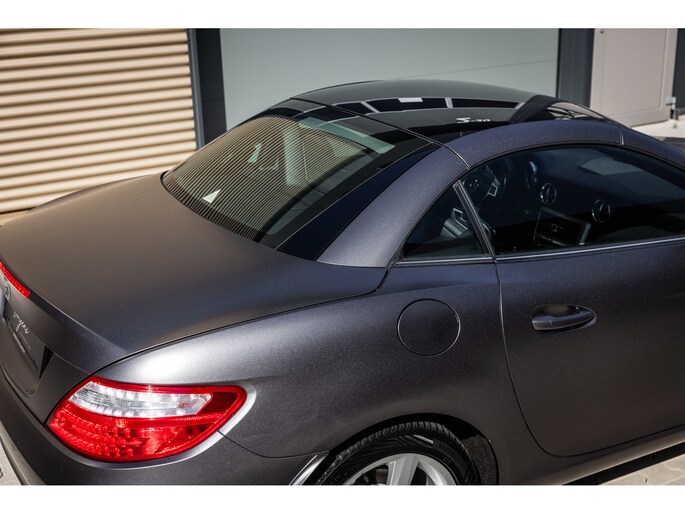 De SLK is origineel geleverd in de zwart kleur – Obsidian Black. In dit geval is de auto gewrapt in de donkergrijze satijn wrap Tenorite Grau. Dit geeft hem een unieke sportieve en luxe uitstraling en het combineert prachtig met het zwarte interieur. Mooie details zijn de 5-spaaks originele lichtmetalen velgen en de LED dagrijverlichting.