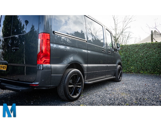De getoonde 18inch wielen met nieuwe Continental banden zijn tegen meerprijs van €1895,- ex de BTW, bus wordt standaard met de originele 16inch Mercedes velgen met zomerbanden geleverd.