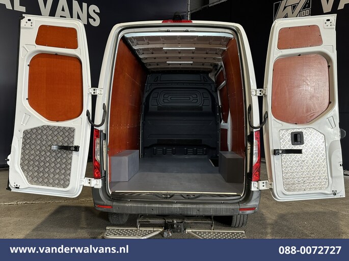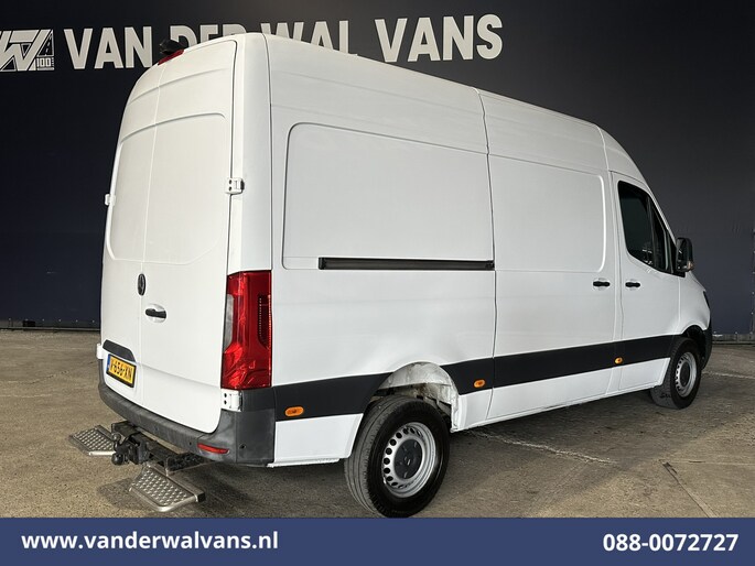 164pk sterke Sprinter L2H2 Euro6 met airconditioning, inrichting en 3500kg trekhaak. Dealer onderhouden en voorzien van camera, Apple Carplay, Android Auto, cruisecontrol, parkeersensoren en bluetooth telefoonvoorbereiding.