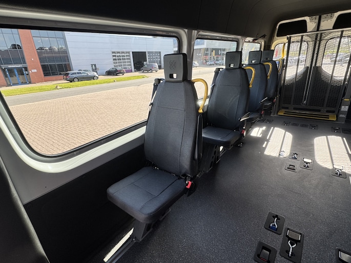 Daarnaast is deze rolstoelbus standaard voorzien van 8-lichtgewicht opklapbare stoelen allemaal uitgerust met ISOFIX, armleggers en gele vasthoudbeugels.