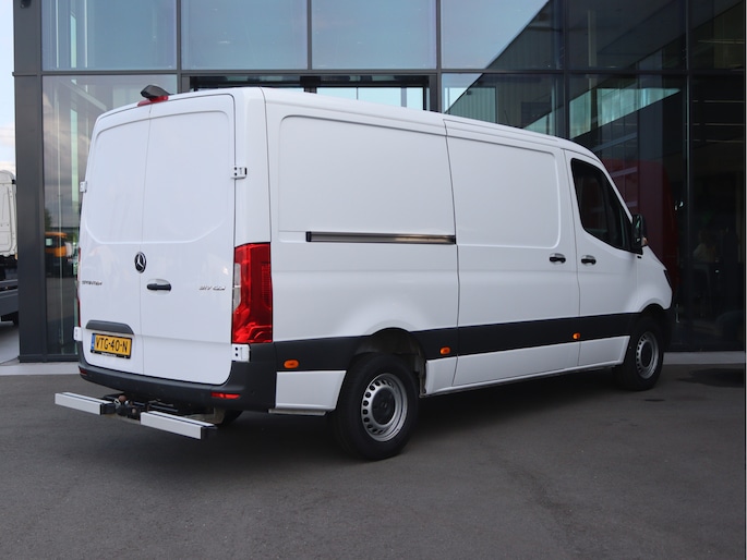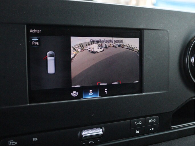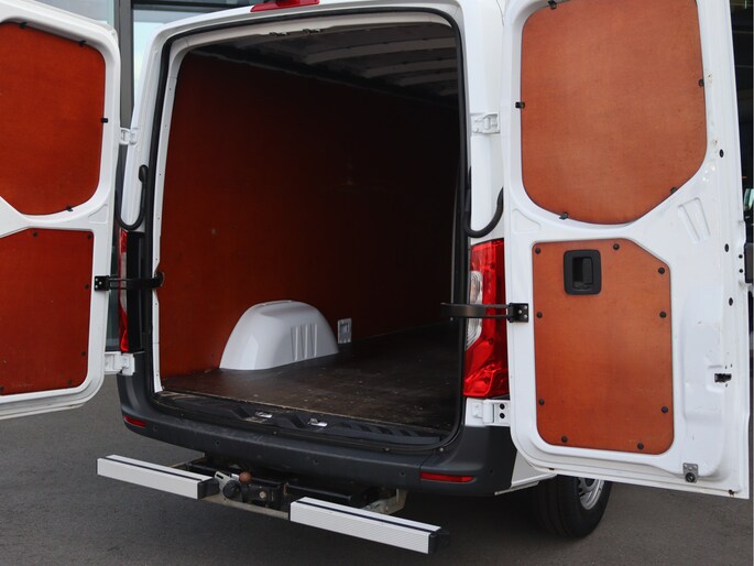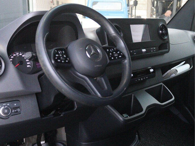 De Sprinter is o.a. voorzien van airco, 7" MBUX multimediasysteem, Apple Carplay/AndroidPLay, achteruitrijcamera, parkeersensoren voor en achter, cruise control, trekhaak met 3.500 kg trekgewicht, achter-opstap en volledige laadruimte betimmering.