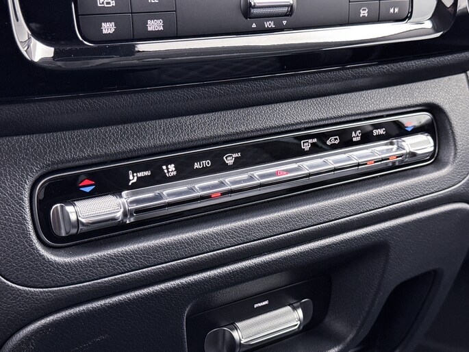 Het interieur is voorzien van een exclusieve leder/alcantara bekleding met witte stiksels – niet alleen op de voorstoelen, maar ook de volledig aangepaste tweede zitrij is in dezelfde hoogwaardige stijl uitgevoerd. Zo biedt deze dubbele cabine niet alleen ruimte, maar ook comfort en uitstraling voor alle inzittenden. De buitenkant is voorzien van een strakke striping in wit, zwart en grijs, wat het sportieve karakter van de Vito versterkt zonder over de top te gaan.