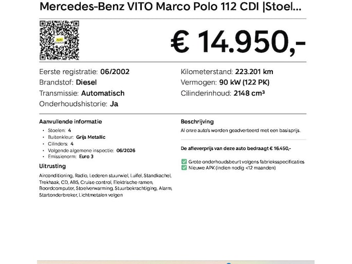 De 112 CDI-dieselmotor levert voldoende kracht voor langere reizen, bergachtige routes en ontspannen cruisen over de snelweg. Daarbij maken opties zoals stoelverwarming, airco, goede stoelen en een prettige zitpositie het rijden niet alleen comfortabel, maar zelfs aangenaam tijdens lange dagen op pad. De trekhaak biedt extra flexibiliteit: fietsen mee, aanhanger, of zelfs een compacte boot? Geen probleem.
