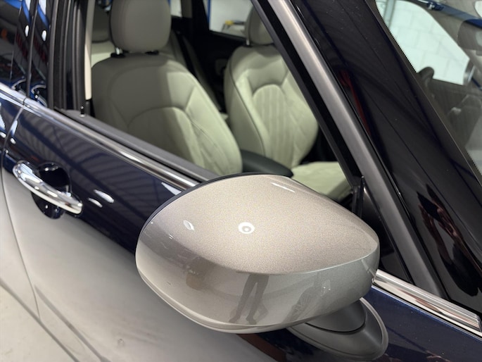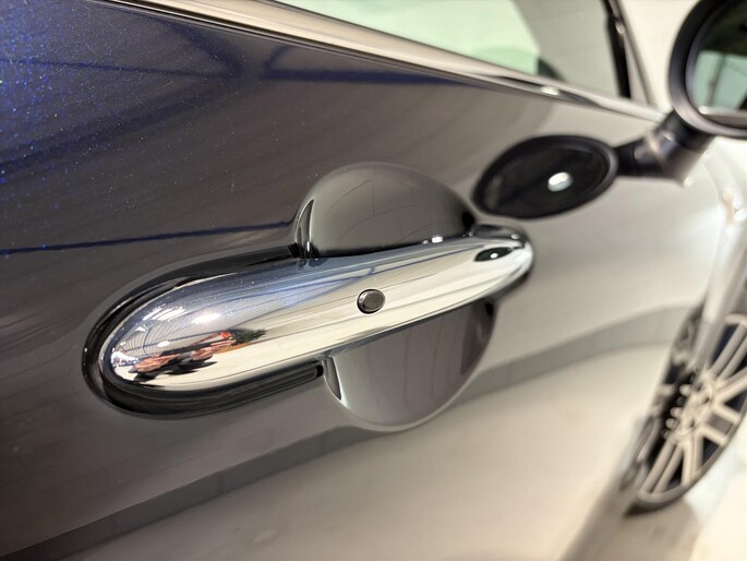 Bijzondere Mini Yours uitvoering in blauw metallic met champagnekleurig dak in combinatie met prachtige beige lederen interieur met ruitpatroon. Afgemaakt met de Union Jack velgen in contrast kleur.
