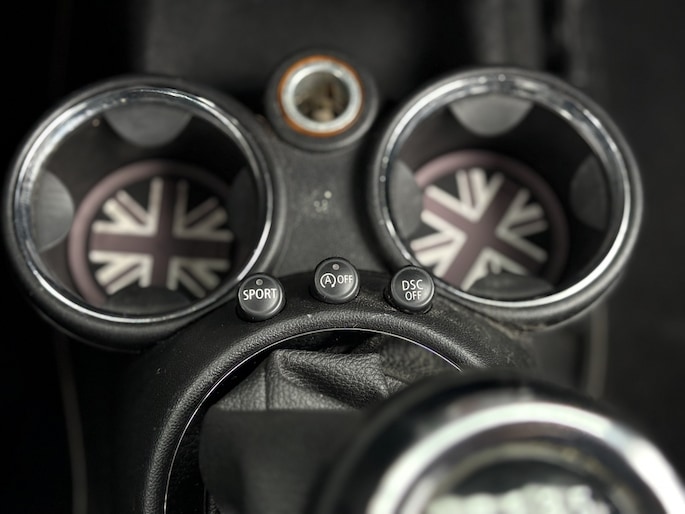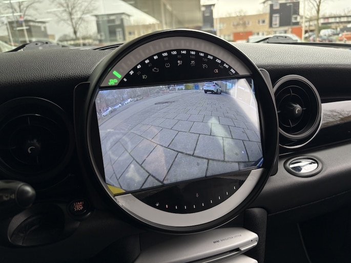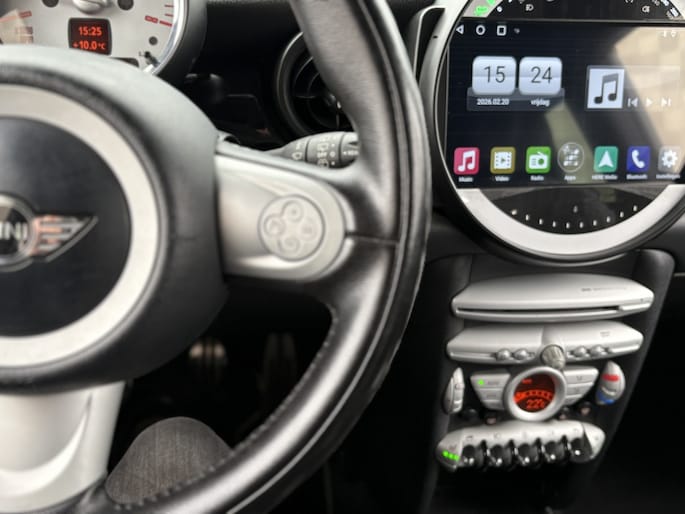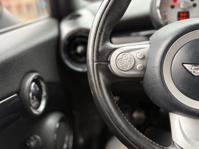 U kunt het audio-installatiesysteem bedienen met de knoppen op het stuur. Automatische airconditioning verwarmt of koelt het interieur met een druk op de knop. De regensensor reageert op de neerslag die op de voorruit belandt. Van een paar spatjes tot een hoosbui: de ruitenwissers weten wat ze te doen staat. De cruise control vermindert het brandstofverbruik en vergroot het comfort. Ook is de Mini uitgerust met: buitentemperatuurmeter, automatisch dimmende spiegels, lederen stuur en boordcomputer.