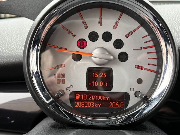 U kunt het audio-installatiesysteem bedienen met de knoppen op het stuur. Automatische airconditioning verwarmt of koelt het interieur met een druk op de knop. De regensensor reageert op de neerslag die op de voorruit belandt. Van een paar spatjes tot een hoosbui: de ruitenwissers weten wat ze te doen staat. De cruise control vermindert het brandstofverbruik en vergroot het comfort. Ook is de Mini uitgerust met: buitentemperatuurmeter, automatisch dimmende spiegels, lederen stuur en boordcomputer.