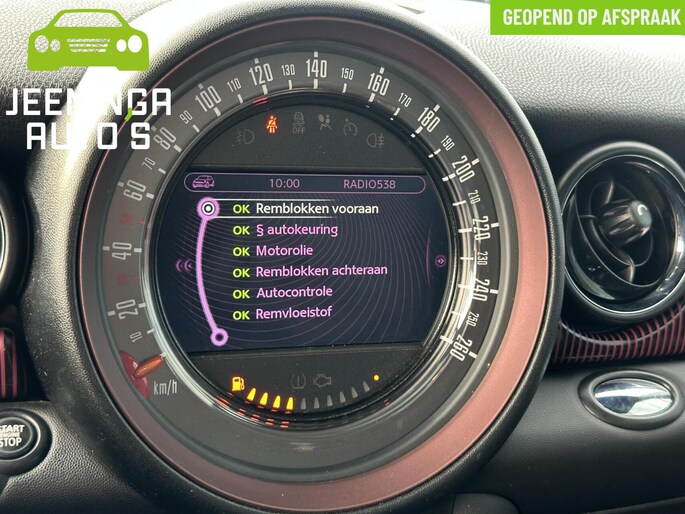 U rijdt gemakkelijk, comfortabel en zonder zorgen met deze Mini Mini. Het is een auto van het bouwjaar 2012, hij heeft 182699 kilometer op de teller staan. De aandrijving van deze Mini wordt verzorgd door een viercilinder benzinemotor en een handgeschakelde versnellingsbak. Houdt u van een luxe uitstraling? Dan is het lederen interieur een heel aantrekkelijke extra! Deze Mini Mini heeft verwarmbare voorstoelen, voor zowel bestuurder als bijrijder. Geniet van de lichtinval en het uitzicht van het grote glazen panoramadak. De motor hoeft alleen te draaien als u rijdt, toch? Daarom heeft deze Mini Mini een start-stopsysteem voor elke keer dat u stilstaat. Voor een stoplicht, in de file, bij de kiss + ride... en dat scheelt brandstof!
