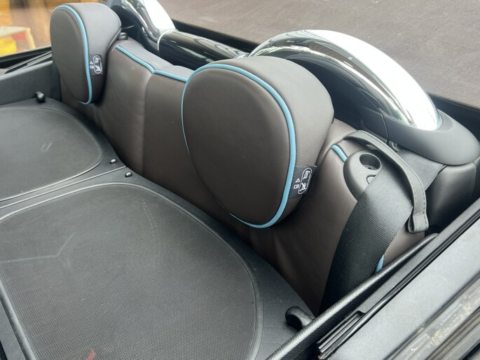 Een complete origineel Nederlandse Mini Cabrio Cooper 1.6 benzine in de kleur "Midnight Black" metallic met een " Silvertouched " Brown cabrio dak.