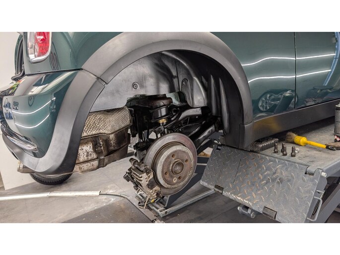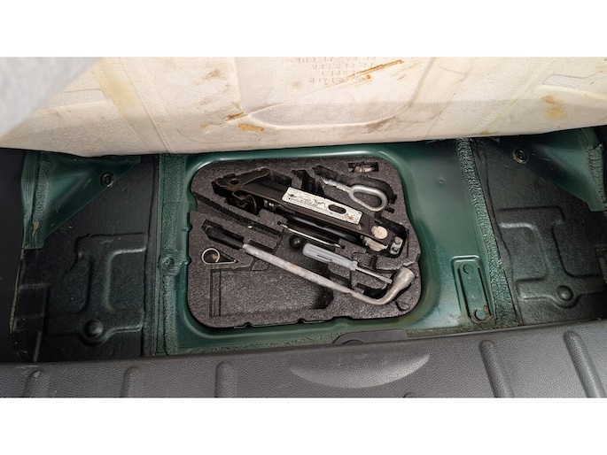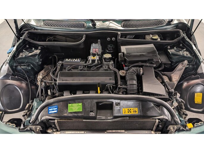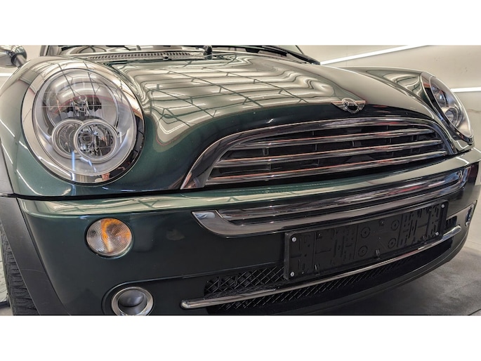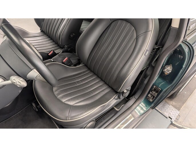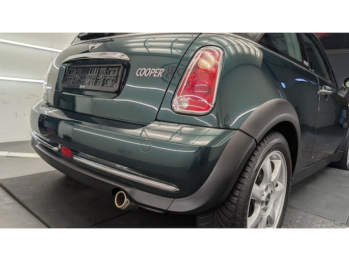 De auto staat volledig in zijn originele groene/grijze lak, wat hem die echte karaktervolle MINI-uitstraling geeft.