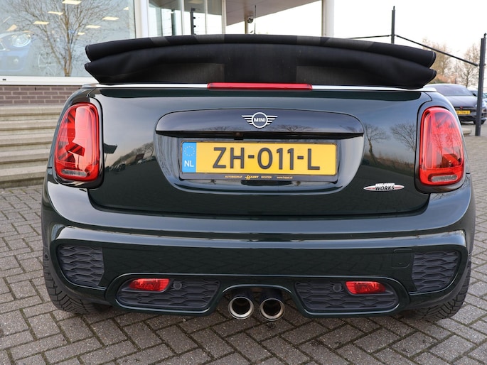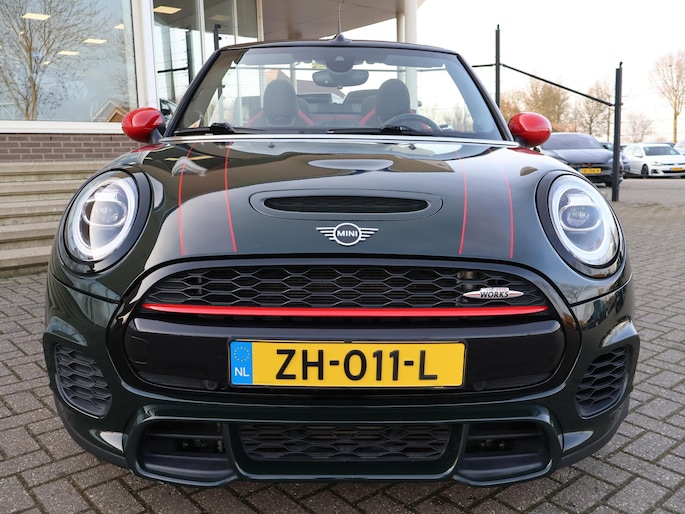 Origineel Nederlandse MINI Cabrio 2.0 John Cooper Works 231 PK automaat in het Rebel Green, RDW nieuwprijs 59.687 euro, Bijzonder compleet met JCW Sportstoelen, Adaptive cruise control, Harman/Kardon premium audio, Apple Carplay / Android Auto, Achteruitrijcamera, Keyless-entry en keyless-drive, Full LED koplampen en LED achterlichten, Zwarte striping met rode accenten, Stoelverwarming, Elektronische voorruitverwarming, DAB digitale radio, Bluetooth, Climate control, Sfeerverlichting interieur met verschillende kleuren, Rode grille en buitenspiegels, Union Jack achterlichten, Union Jack dashboard inleg.