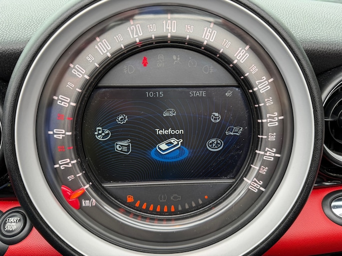 Zoals u mag verwachten van deze Mini Mini Cabrio is hij uitgerust met een reeks aan actieve veiligheidssystemen. Is de bandenspanning aan de lage kant? Dan geeft het bandenspanningscontrolesysteem direct een seintje.
