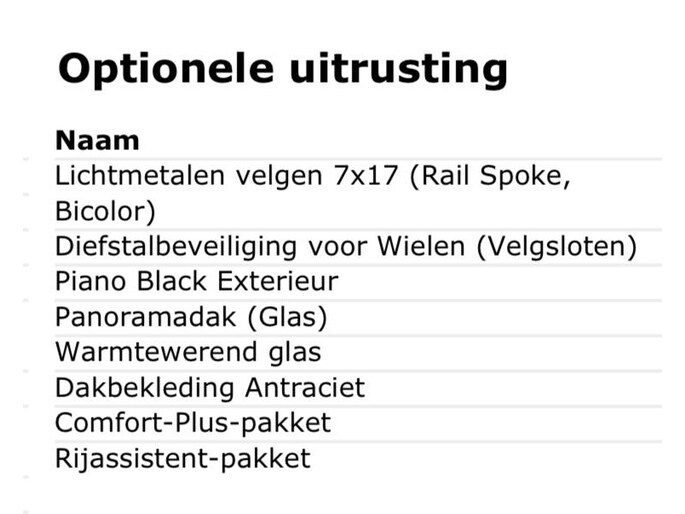 - Comfort plus-pakket (Binnenspiegel automatisch dimmend, Buitenspiegels elektrisch inklapbaar, Verwarmde voorstoelen, Voorstoelen verwarmd)