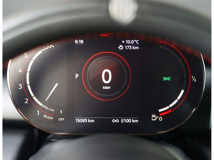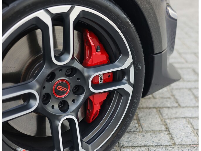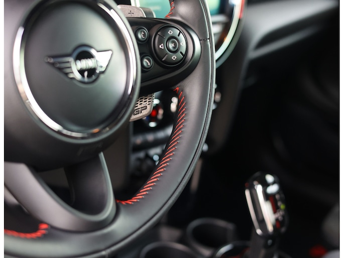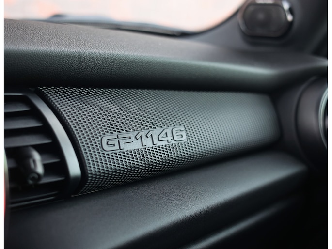 Binnenin draait alles om focus. De achterbank is vervangen door een verstevigingsbrace voor extra stijfheid en gewichtsbesparing. JCW sportstoelen in Dinamica/leder, rode gordels en subtiele GP-details creëren een cockpit die volledig om de bestuurder is gebouwd. Functioneel, direct en zonder overbodigheden.