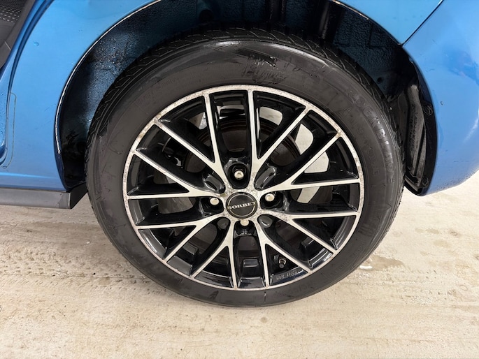 De carrosserie heeft een opvallende blauwe metallic lak die de auto een frisse uitstraling geeft. Het design wordt versterkt door de achterspoiler en de 14-inch lichtmetalen velgen, terwijl het extra getinte glas zorgt voor een sportieve en stijlvolle touch. Bumpers en spiegels in carrosseriekleur maken het geheel strak af.