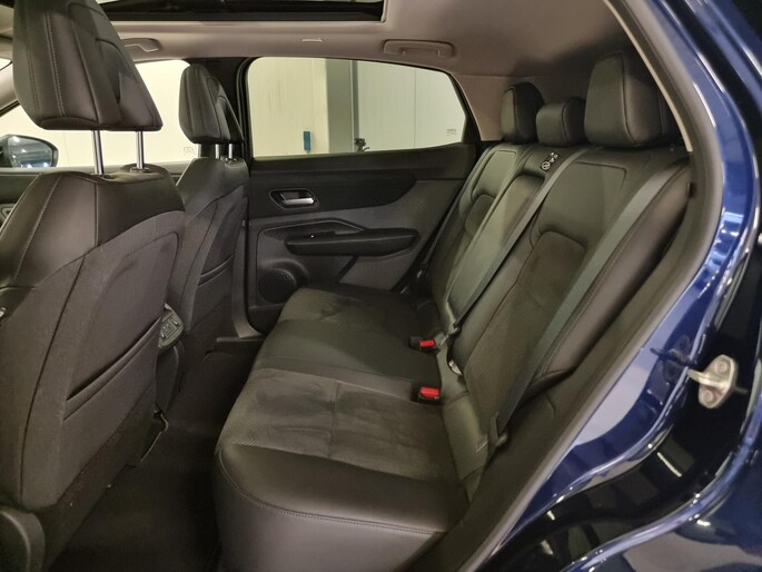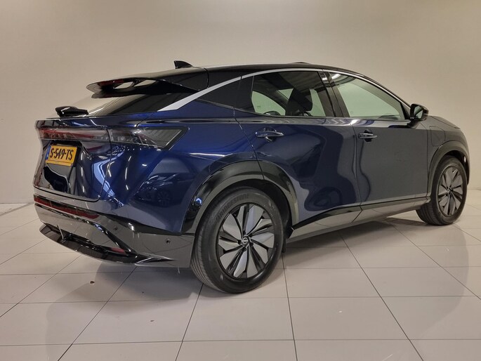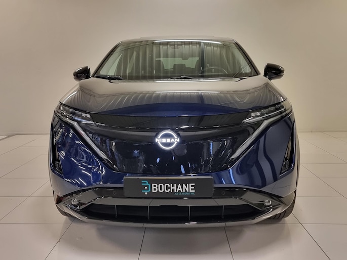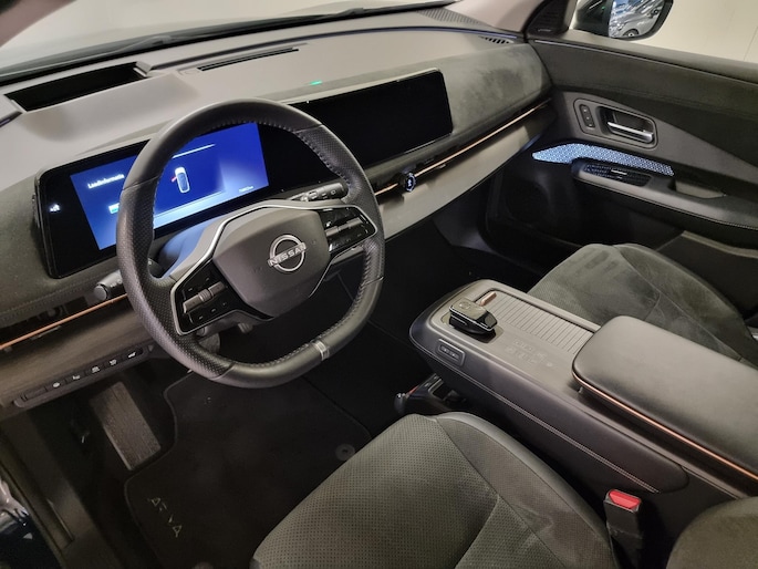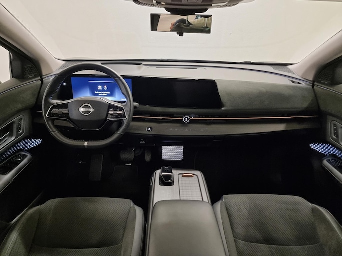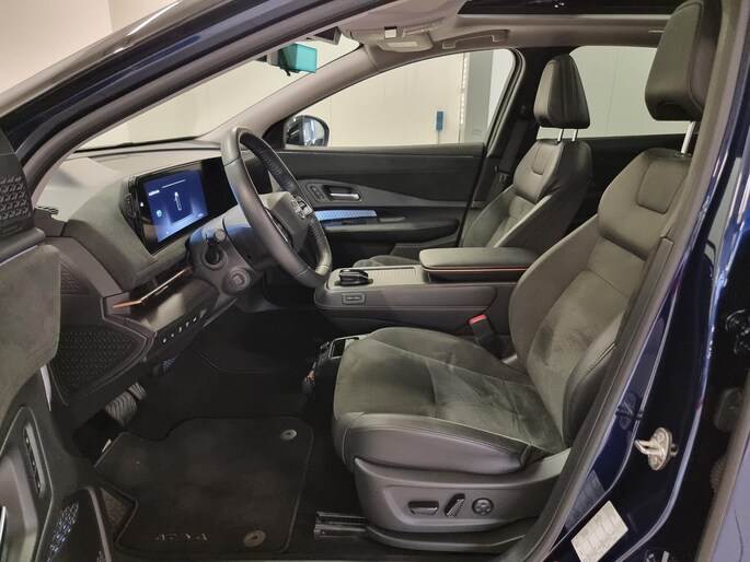 Kijk naar de onvergelijkbare vormgeving. De Nissan Ariya is een elektrische auto die zijn bijzondere karakter niet voor de buitenwereld verbergt. De fluisterstille elektromotor zorgt voor een serene rijervaring. Boven uw hoofd schuiven de wolken zichtbaar voorbij door het elektrisch bediende glazen panorama dak. En kijk eens aan de achterzijde wat gemakkelijk: een eveneens elektrisch bedienbare achterklep! Dankzij de elektrische stoelbediening is het gemakkelijk om de optimale zitpositie te vinden. De achterbankverwarming, het verwarmbare stuurwiel en de verwarmbare voorstoelen brengen passagiers en bestuurder snel weer op temperatuur, ongeacht hoe koud het buiten is. Natuurlijk behoren 19 inch lichtmetalen velgen, LED koplampen, extra getint glas, in delen neerklapbare achterbank en LED-achterlichten ook tot de uitrusting van deze complete auto.