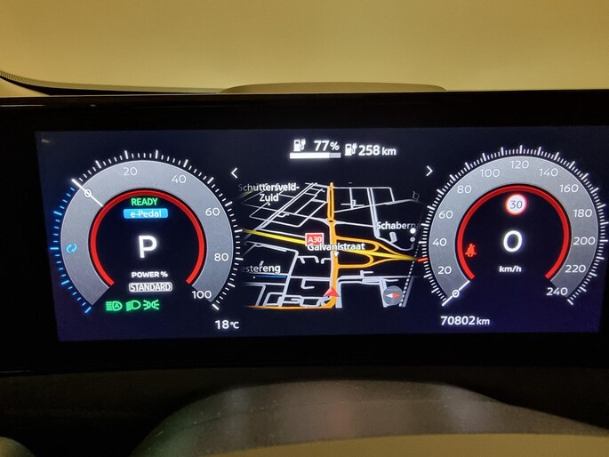 Het slim uitgedachte digitale dashboard toont alle essentiële ritinformatie in één oogopslag. De 360 graden camera biedt een beter zicht bij slechte weersomstandigheden, waardoor u beter kan anticiperen op mogelijke gevaren. Adaptive cruise control is een comfortabele en veilige optie. Het systeem reguleert de snelheid en houdt automatisch afstand tot uw voorligger. Na een lange werkdag in de file: daar zit niemand op te wachten. Gelukkig helpt de file assistent een handje. Het radarsysteem meet de ruimte tot de voorligger en bewaakt de juiste afstand. Stilstaan? Dan remt en stopt de auto vanzelf. Connected Services voegt nog meer comfort en veiligheid toe aan deze auto. De Nissan is standaard voorzien van: dashboard met spraakbediening, premium audiosysteem, full map navigatiesysteem, automatische airconditioning, draadloos opladen en DAB ontvangst.