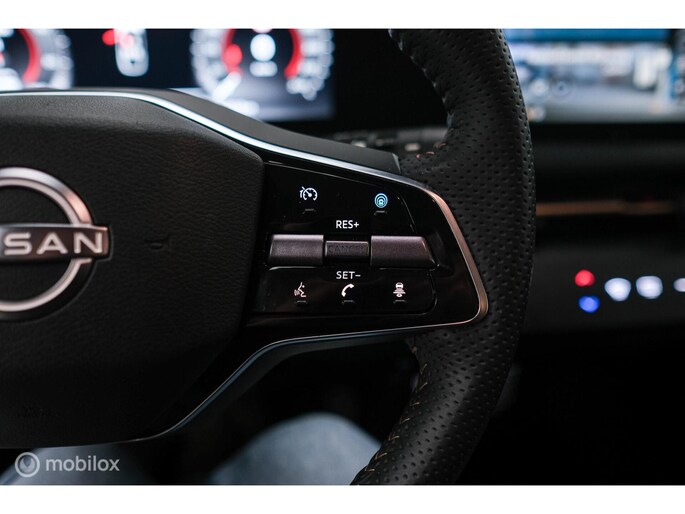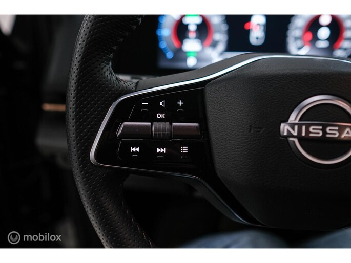 Met het digitale dashboard kunt u de cockpit-interface naar uw voorkeur instellen. De 360 graden camera op deze auto is een innovatieve functie die de obstakels rondom de auto in beeld brengt voor een optimaal zicht. Adaptive cruise control houdt de ingestelde snelheid vast en houdt afstand tot het voertuig voor u. Na een lange werkdag in de file: daar zit niemand op te wachten. Gelukkig helpt de file assistent een handje. Het radarsysteem meet de ruimte tot de voorligger en bewaakt de juiste afstand. Stilstaan? Dan remt en stopt de auto vanzelf. Dankzij Connected Services heeft u overal en altijd uw dashboard op zak. Alle belangrijke functies zijn te checken via de app. Ook is de Nissan uitgerust met: dashboard met spraakbediening, full map navigatiesysteem, automatische airconditioning, draadloos opladen, DAB ontvangst en regensensor.