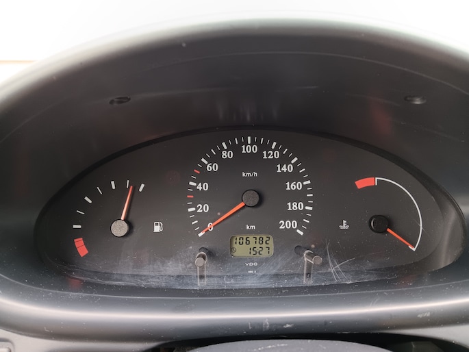 Slechts 107.000 kloppende KM's, fris rood met een Pioneer radio CD-speler, wat lichte gebruikssporen én een trekhaak.