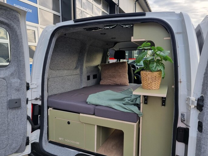 Fraaie Nissan NV200 1.6 St. Maxime MINICAMPER welke voorzien is van een riant bed, ruime zitbank, wandkast met diverse opbergmogelijkheden, walstroomaansluiting met 220V wandcontactdoos + aardlekschakelaar, ingebouwde plafondspotjes, USB (C)aansluitingen, koelkast in uitschuiflade, kooktoestel, Boxio toilet, spoelbak met kraan en ruime opbergvakken voor diverse spullen.