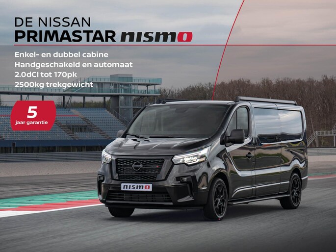 Uniek bij ABD: de Nissan Primastar Nismo! Nismo staat voor Nissan Motorsport en is de performance tak van Nissan, waar passie voor autosport en innovatieve techniek samenkomen. De uitvoeringen zijn gericht op echte rijliefhebbers die meer verwachten van een auto dan alleen van A naar B te rijden. Nismo is bekend van onder andere de Nissan GTR en 370Z. De Primastar Nismo uitvoering staat aan de top van het gamma en is in beperkte oplage verkrijgbaar bij ABD. Deze Primastar Nismo+ is onder ander voorzien van: 2.0dCi motor, laadruimte betimmering, 18" lichtmetalen velgen, sidesteps, roofrails, navigatie, Apple Carplay en Android auto, achteruitrijcamera, LED koplampen, Nismo grill, Nismo bekleding en Nismo type aanduiding interieur & exterieur. Klaar om over te stappen? Dan profiteert u van een hoge korting, 5 jaar garantie. Prijs is exclusief rijklaarmaakkosten.