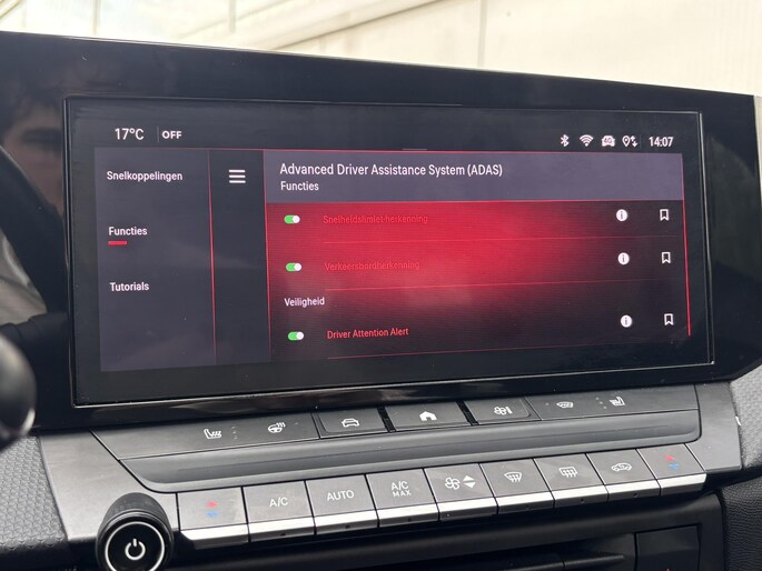 Aan boord van deze Opel houden verschillende geavanceerde systemen voor u de weg in de gaten. Ze waarschuwen u voor noodsituaties en kunnen in een aantal gevallen ook zelf ingrijpen. De head-up display projecteert alle gewenste dashboardinformatie op de juiste hoogte in de voorruit. Verkeersborddetectie herkent tijdelijke en permanente verkeersborden langs en boven de weg. Met het Lane-keeping systeem gaat u nooit onbedoeld over de streep. In deze Opel vinden we verder een dodehoekdetector detectiesysteem, hill hold functie, vermoeidheidsherkenning, autonoom remsysteem en bandenspanningcontrolesysteem.
