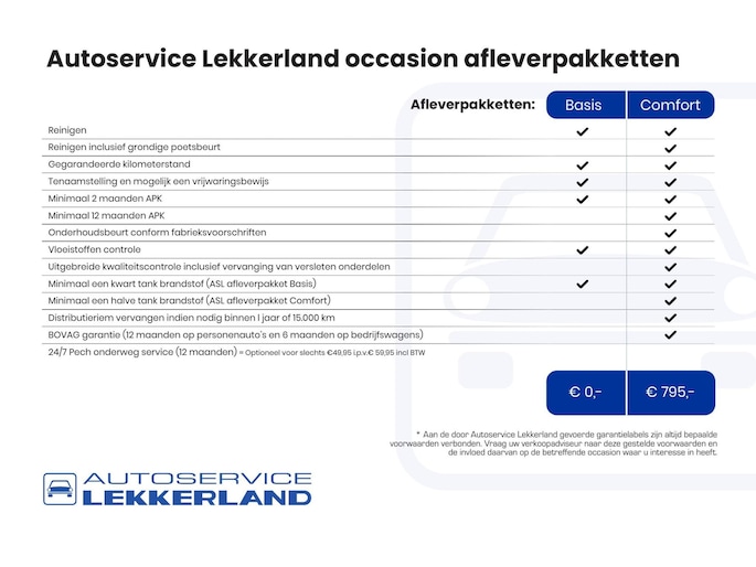 De getoonde prijs van onze occasions is inclusief alle onvermijdbare kosten, zoals kenteken tenaamstelling en – indien van toepassing – een RDW-vrijwaring voor uw inruilauto. Voor een zorgeloze aflevering van uw ‘nieuwe’ auto adviseren wij ons Comfort afleverpakket. Voor slechts € 795,- wordt alles tot in de puntjes verzorgd en profiteert u van extra zekerheden.