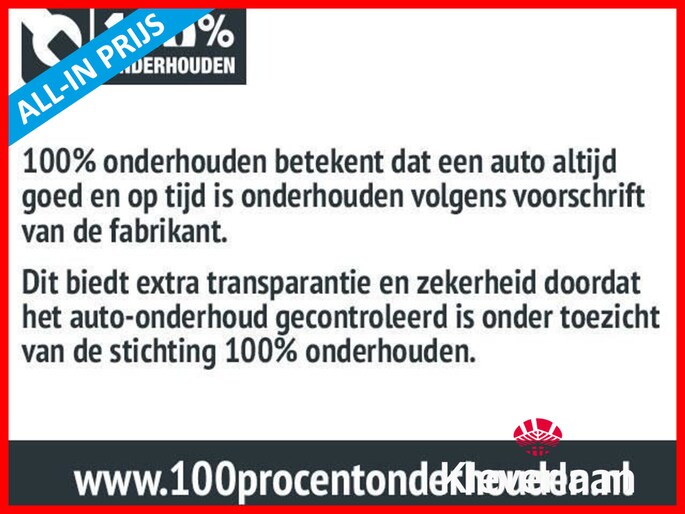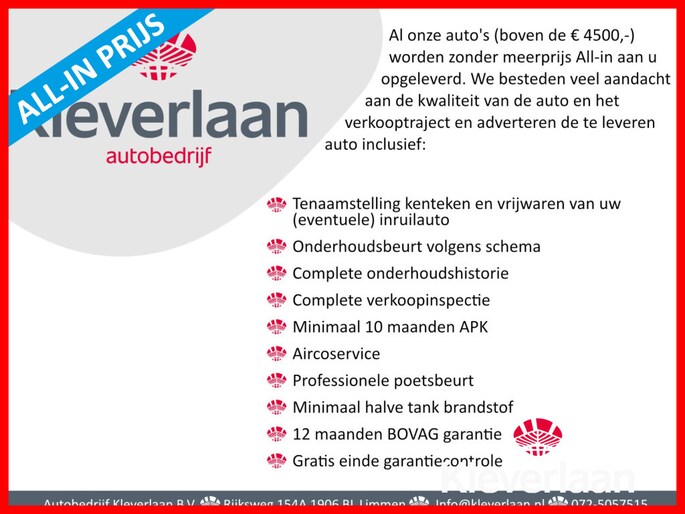 Hoewel aan de informatie van deze advertentie de grootst mogelijke zorg wordt besteed, kan Kleverlaan BV niet aansprakelijk worden gesteld voor eventuele onjuiste informatie van welke aard dan ook. Informeer bij onze verkoopadviseurs voor de exacte uitvoering en beschikbaarheid van de auto.