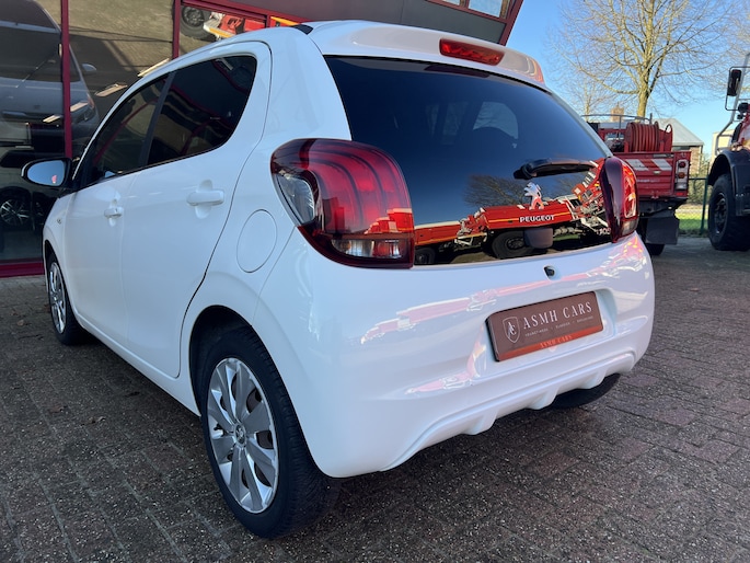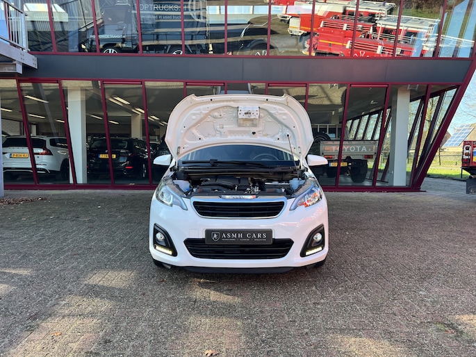 Super leuke Peugeot 108 1.0 e-VTi Active Top in een fris witte kleur met zwarte en chromen exterieuraccenten en een bordeauxrood stoffen electrisch cabriodak.