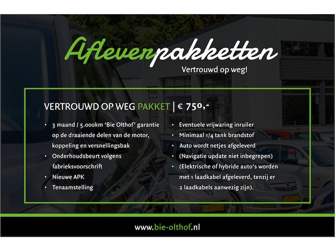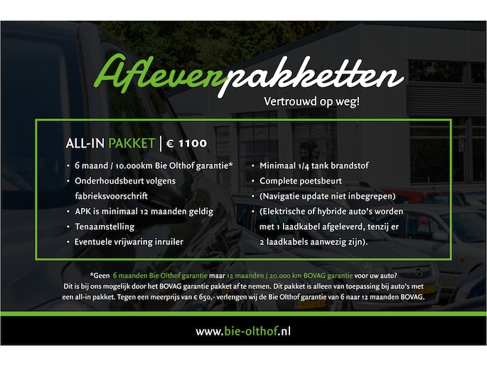 * Geen 6 maanden Bie Olthof maar 12 maanden / 20.000 BOVAG garantie? Dat kan tegen een bijbetaling van €650,-. (alleen mogelijk i.c.m. het all-in afleverpakket).