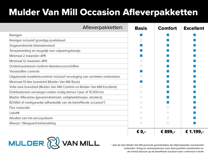 Standaard leveren wij onze kwaliteitsoccasions inclusief het ‘Mulder Van Mill Occasion Basis Afleverpakket’, waarin alle onvermijdelijke kosten zijn inbegrepen, zoals kenteken tenaamstelling en, indien van toepassing, een RDW-vrijwaring voor uw inruilauto. Om uw 'nieuwe' auto in de best mogelijke staat af te leveren, adviseren wij u te kiezen voor een upgrade. Voor slechts € 999,- bieden wij het ‘Mulder Van Mill Occasion Comfort Afleverpakket’ aan, waarbij alles tot in de puntjes wordt verzorgd en u kunt rekenen op uitgebreide garantiezekerheden. Voor een meer complete ervaring kunt u, tegen een meerprijs van € 300,-, ook het ‘Mulder Van Mill Occasion Excellent Afleverpakket’ kiezen.