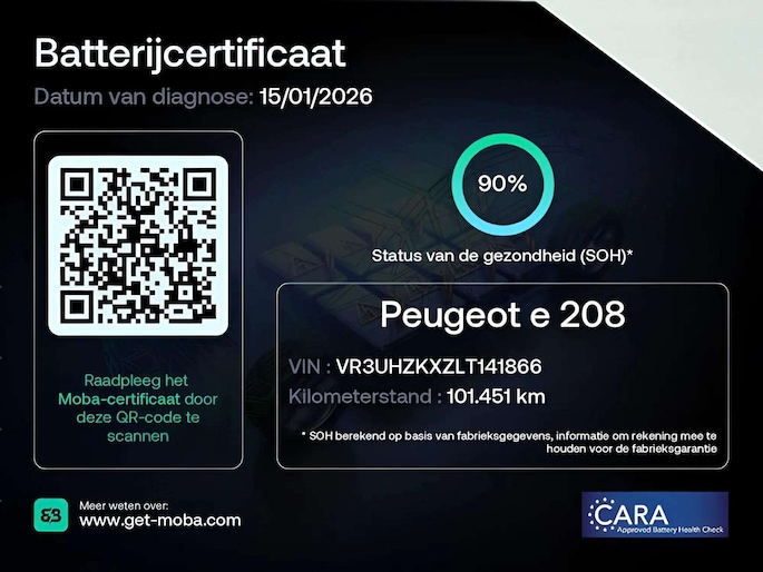 De auto beschikt over een accu met een State of Health van circa 90%, wat garant staat voor een goede actieradius en betrouwbare prestaties.