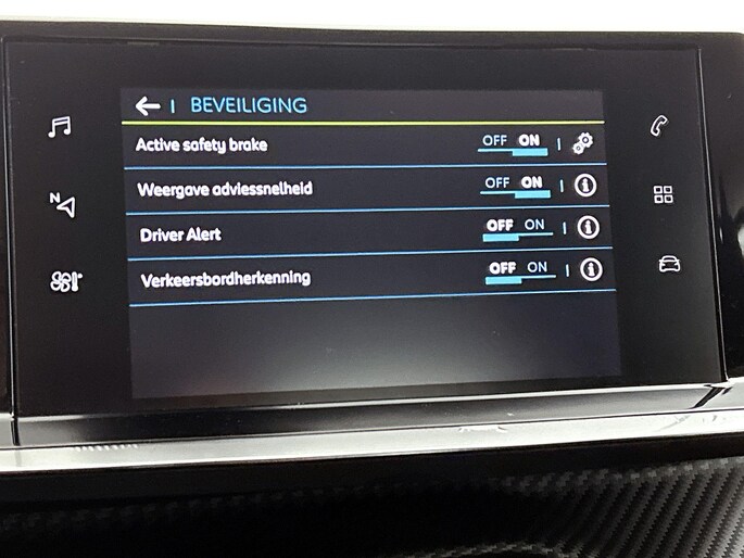 De nieuwste veiligheidssystemen komen in deze Peugeot e-208 samen. De actuele snelheidslimiet, een inhaalverbod en andere verkeersborden. De verkeersborddetectie ondersteunt u tijdens elke rit. Met het Lane-keeping systeem gaat u nooit onbedoeld over de streep. Forward collision warning waarschuwt voor een kop-staart botsing. Ook helpen het vermoeidheidsherkenning en bandenspanningcontrolesysteem, uw rit tot een veilige rit te maken.