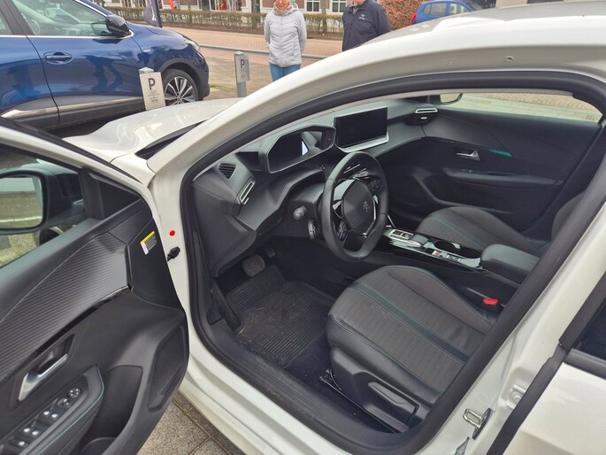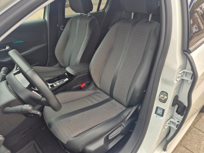 Deze frisse witte E-208 rijdt volledig elektrisch, is voorzien van automaat en combineert comfort met een sportieve uitstraling.