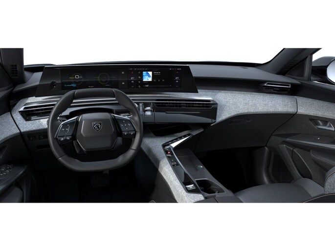 PEUGEOT Panoramic i Cockpit® met zwevend dubbel HD scherm (2 x 10'') Stijlelementen (Middenconsole bekleed met gemêleerde stof RIMINI, glanzend zwart frontpaneel , strip in Stene Grey en armleuning bekleed met gemêleerde stof RIMINI, Portierbekleding in gemêleerde stof RIMINI, bergruimte in grafeen en strip in Stene Grey, kunstleder armsteunen voorin afgewerkt met stiksel, Zacht dashboard bekleed met gemêleerde stof RIMINI en open bergruimte in grafeen , glanzend zwart voorpaneel en ventilatieopeningen met decoratie in Stene Grey)