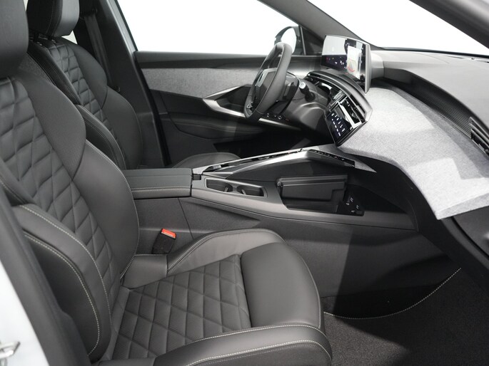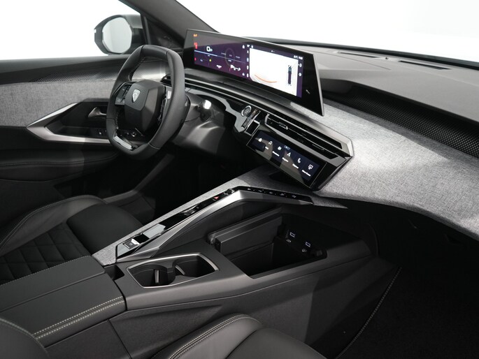 - PEUGEOT Panoramic i Cockpit® met zwevend dubbel HD scherm (2 x 10'') Stijlelementen (Middenconsole bekleed met gemêleerde stof RIMINI, glanzend zwart frontpaneel , strip in Stene Grey en armleuning bekleed met gemêleerde stof RIMINI, Portierbekleding in gemêleerde stof RIMINI, bergruimte in grafeen en strip in Stene Grey, kunstleder armsteunen voorin afgewerkt met stiksel, Zacht dashboard bekleed met gemêleerde stof RIMINI en open bergruimte in grafeen , glanzend zwart voorpaneel en ventilatieopeningen met decoratie in Stene Grey)