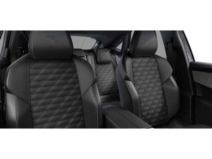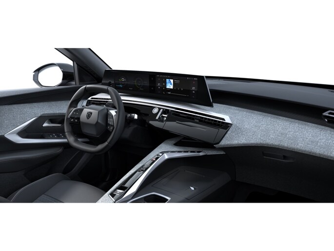 PEUGEOT Panoramic i Cockpit® met zwevend dubbel HD scherm (2 x 10'') Stijlelementen (Middenconsole bekleed met gemêleerde stof RIMINI, glanzend zwart frontpaneel , strip in Stene Grey en armleuning bekleed met gemêleerde stof RIMINI, Portierbekleding in gemêleerde stof RIMINI, bergruimte in grafeen en strip in Stene Grey, kunstleder armsteunen voorin afgewerkt met stiksel, Zacht dashboard bekleed met gemêleerde stof RIMINI en open bergruimte in grafeen , glanzend zwart voorpaneel en ventilatieopeningen met decoratie in Stene Grey)