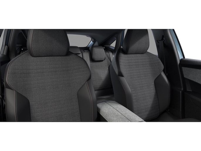 - Portierbekleding in gemêleerde stof RIMINI, bergruimte in grafeen en strip in Stene Grey, kunstleder armsteunen voorin afgewerkt met stiksel