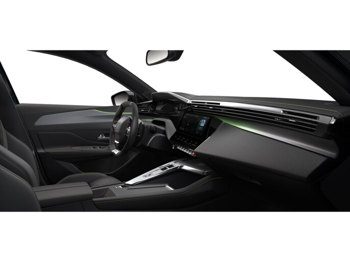 - Dashboard, middenconsole en stuurwiel afgewerkt met groen stiksel