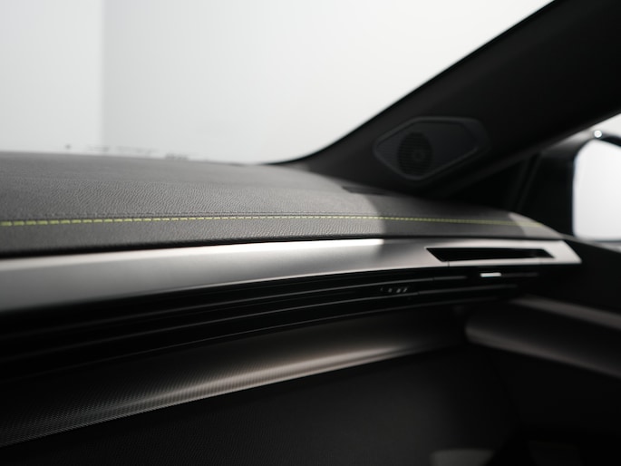 - Zacht dashboard met Alcantara decoratie, chromen sierlijst en stiksels in groen Adamite