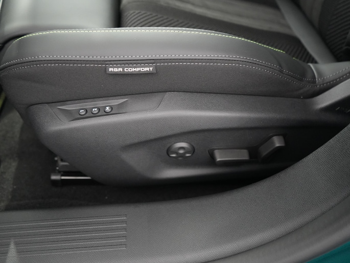 - Compact, met generfd en geperforeerd leder bekleed 'GT' stuurwiel met geïntegreerde bedieningsknoppen, stiksels in groen Adamite