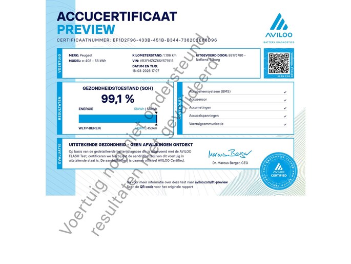Een van de sterkste Franse merken, al tientallen jaren. Motion & Emotion, zeggen we bij Peugeot. Het aantal kilometers dat u op een acculading kunt rijden, is ruimschoots genoeg voor de gangbare dagelijkse ritten, en het opladen kan in de meeste gevallen 's nachts gebeuren. Deze auto uit 2025 heeft nauwelijks gereden, met een tellerstand van slechts 1106 kilometer. Tijdens gure dagen is het prettig zitten in de verwarmbare voorstoelen. Voor het pittige uiterlijk én goed gesteund zitten zorgen de sportstoelen. Deze Peugeot e-408 heeft een verwarmd stuurwiel. Nooit meer koude handen onderweg. Natuurlijk behoren 19 inch lichtmetalen velgen, LED koplampen, extra getint glas, in delen neerklapbare achterbank en verstelbare lendensteunen ook tot de uitrusting van deze complete auto.