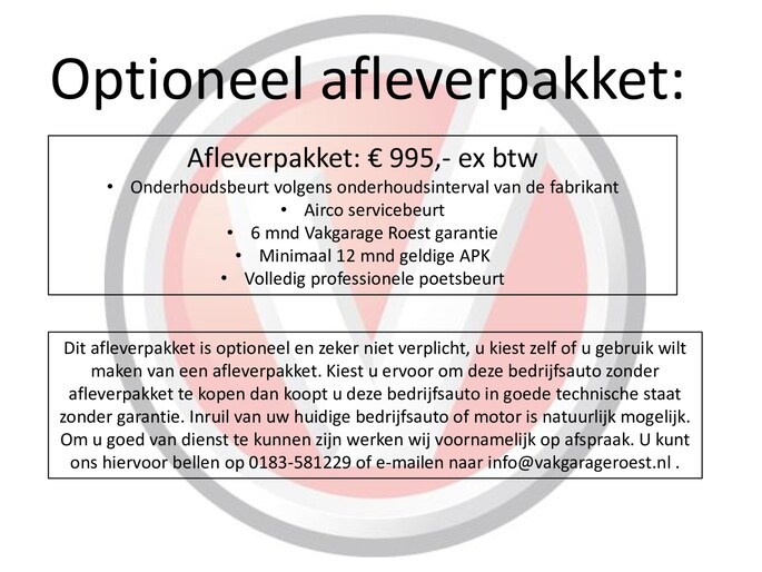 Origineel Nederlandse bedrijfsauto. 1e eigenaar bedrijfsauto. 2 sleutels + boekjes aanwezig. Navigatie alleen mogelijk i.c.m. uw telefoon (Apple Carplay / Android Auto). Let op: Alle genoemde prijzen zijn exclusief BTW. Nationale autopas en geldige APK. U kunt deze auto kopen voor de geadverteerde prijs, tevens kunt u deze bedrijfsauto kopen met een afleverpakket (zie het overzicht tussen de foto's). Inruil van uw huidige (bedrijfs)auto of motor is natuurlijk mogelijk. Bezichtiging en proefrit met afspraak mogelijk.